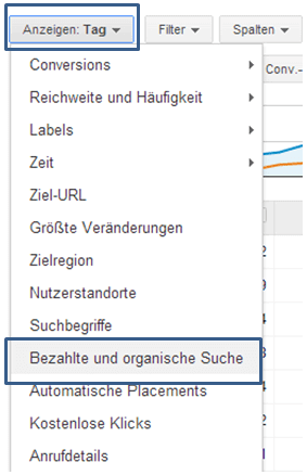 auf das Drop-Down Menü der Anzeigen auf den Report „Bezahlte und organische Suche“.