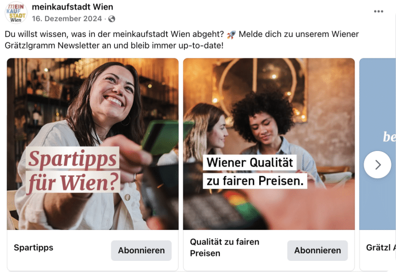 Die MEINKAUFSTADT Wien informiert in ihrem Newsletter über Events, neue Geschäfte, Lokale und vieles mehr – zur Stärkung der Kaufkraft und Unterstützung der Wiener Unternehmen. Generiert werden Newsletter-Abos über Website und Social Media.
